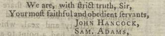 The British newspaper/magazine "Gentleman's Magazine" gave top billing to the "Report of the Committee of Boston, on a late Massacre" as shown by a portion of the front page index pictured above. The following page was the full page report of the committee which was signed by John Hancock, Dr. Joseph Warren (as General Warren he was killed at the Battle of Bunker hill, famously portrayed by Jonathan Trumbull in his painting of the battle). Below is the start and end of the report with the top portion of the signatures of the committee members.