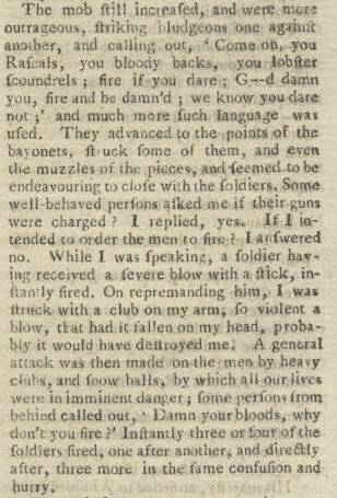Early Report of Boston Massacre, March 5, 1770 Full Text of Committee of Boston Report Signed in Type by John Hancock and Sam Adams "a party of seven or eight soldiers, were detached from the main-guard, under the command of captain Preston, and by his orders fired upon the inhabitants, promiscuously, in King-street, without the least warning of their intention.." Also Includes Account of Incident by British Captain Preston "A general attack was then made on the men by heavy clubs, and by snow balls, by which all our lives were in imminent danger; some persons behind called out 'Damn your bloods, why don't you fire?' Instantly three or four of the soldiers fired, one after the other, and then directly after three more, in the same confusion and hurry."