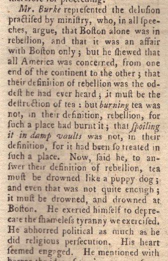 In the excerpt below from the Parliamentary debate on the King's address the great orator, thinker and writer Edmund Burke responds to the King's declaration that the American colonies are in rebelliion. He makes reference to the Boston Tea Party which provoked the severe sanctions of the Boston Port Closure bill and the sending of troops to enforce it that led to the battles of Lexington and Concord.