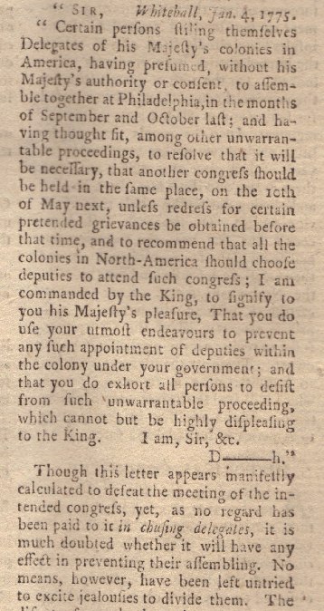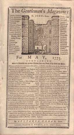 The Battles of Lexington and Concord "Shot Heard Round the World" First Report of the Skirmish Delivered to British Public in May 1775 British Try to Prevent Continental Congress From Meeting and Declare America in Rebellion The highlight of this May 1775 issue of Gentleman's Magazine is an amazingly quick account of the April 19, 1775 battle between British troops and American militia at Lexington and Concord, about 15 miles from Boston, Massachusetts. The trade-off with the news reaching across the Atlantic so quickly is that the report is inaccurate and overstates the number of troops killed on both sides. There is much more in this issue concerning the conflict between the British and Americans, including the full text of a letter to royal governors in America instructing them to prevent assemblies from choosing delegates to the Second Continental Congress, with a report on its ineffectual result. The issue also includes an extensive account of the debate in Parliament on a response to King George III's address in which he declared the American colonies "in rebellion" and pledged his wealth and honor to the suppression of the rebellion. Pictured below are some excerpts from his historic issue. Below is some of the preliminary report of the battles of Lexington and Concord.