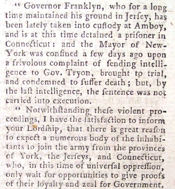 The magazine notes the capture of the Loyalist New Jersey Governor, Ben Franklin's son, and holds out hope that Americans will join with British forces and "give proofs of their loyalty and zeal for Government":