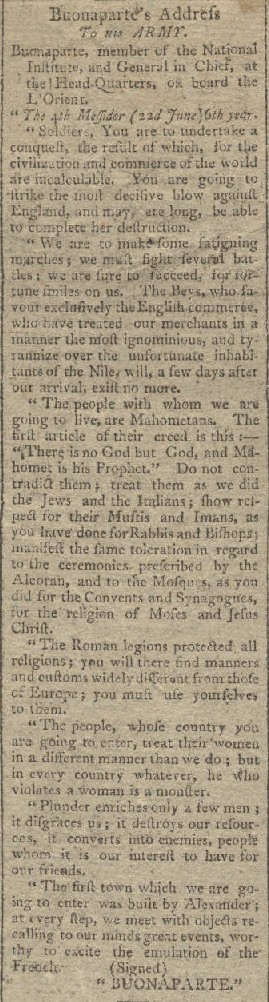 1798 Newspaper Reports Napoleon Invasion of Egypt Lord Nelson Destroys French Fleet Congressman Matthew Lyon in Prison Under Sedition Act This 1798 newspaper with a nice masthead reports on Napoleon Bonaparte's successful invasion of Egypt and on Lord Nelson's equally successful naval victory over the French fleet. It provides extensive reports on both of these historic events from a British and French perspective. Among the interesting details provided in the newspaper is the complete text of Napoleon's address to his troops before the invasion (pictured below) in which he counsels respect for the Muslim religion, their mosques and religious leaders, enjoins against plundering and makes reference to the victories of Roman legions and Alexander the great to inspire his troops. Also shown below is a report of Napoleon's taking of both Alexandria and Cairo.