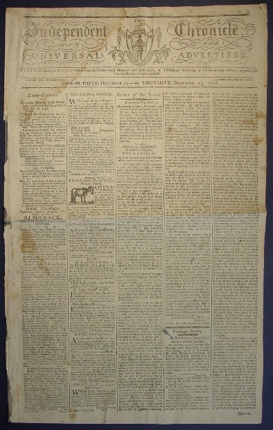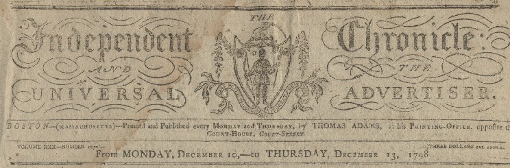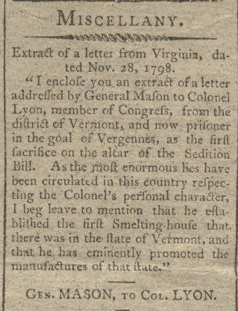 Nor is this newspaper without interesting domestic news. One of the more interesting incidents in the new Republic involved the threats to freedom of the press as a result of the enactment of the infamous Sedition Act, which was first applied to a Vermont newspaper publisher who also happened to be a Revolutionary War hero and current Congressman, Mathew Lyon. The newspaper contains the full text of a letter from General Mason of Virginia to Colonel Lyons, "now prisoner in the goal [jail] of Vergennes." The history of the Matthew Lyon and his imprisonment was recently set out in a Congressional concurrent resolution requesting that a commemorative postage stamp be issued honoring Lyons. Mason's letter to Lyon is a brief for freedom of press and records the reaction to Lyon's imprisonment: