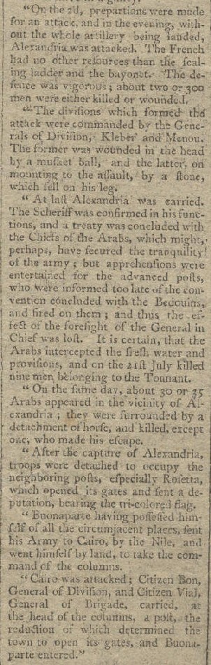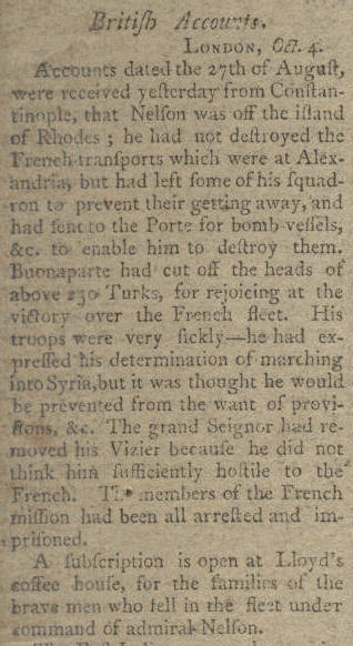 The other great historic event that took place at the same time was the victory of Admiral Horatio Nelson, later Lord Nelson, over the French fleet off the coast of Egypt. The newspaper provides a front page first person account from a French officer who witnessed it from at Rosetta, Egypt and there are British accounts of the battle and its aftermath as well. The newspaper reports, for instance, that "Bonaparte had cut off the heads of 250 Turks, for rejoicing at the victory over the French fleet."