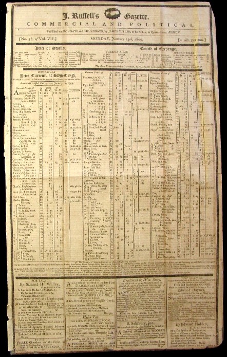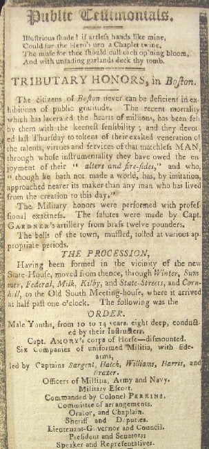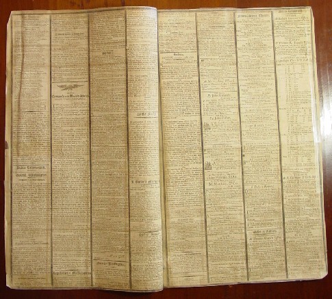 The most extensive report on the Boston ceremonies is on the last of four pages. Inside the paper is also full of reports and all the columns are black bordered as shown by the photograph below. The newspaper has some tears and chips along the edges and a prior owner has taped the inside edges with clear tape which we believe is removable (we've removed it from other newspapers) but will leave to the new owner. As shown by all the pictures above and below, the newspaper is in far better condition than you would expect from one over 200 years old. The newspaper also contains a report on a ship launched just two years earlier, the U.S.S. Constitution, and a sailor, Captain Christopher Perry father of two naval heroes who gained fame in the War of 1812 (Oliver) and the opening of Japan to the West (Matthew).