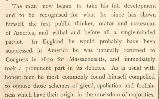 This is an original 1872 Vanity Fair print of the United States Senator from Massachusetts, Charles Sumner, the leading Abolitionist in Congress, who was beaten severely by a Southern while he was in his Senate seat in 1856 and returned four years later to be a major supporter and antagonist to Abraham Lincoln. The print is titled "STATESMEN, No. 113" and under that "The Massive Grievance" which refers to the dispute with England over reparations for the English allowing the Southern warship Alabama to be built on their shores. Included with the print is the description of Sumner by Jehu Junior for Vanity Fair, and an unusually complimentary one it is. Below is a close-up of the Sumner print and an excerpt from the Vanity Fair biography of Sumner.