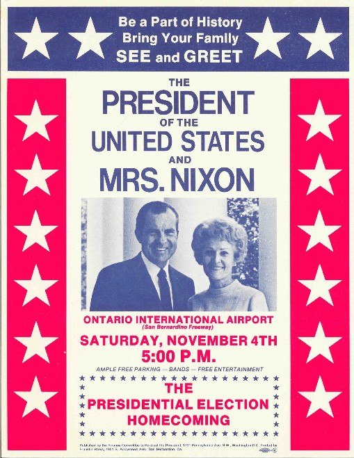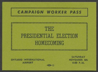 This is a nice combination political and historical memorabilia, the campaign rally broadside from Richard M. Nixon's last election campaign event and a campaign worker pass to that same event. The event on November 4, 1972 was at Ontario International Airport which was near the Nixon home in California where he and his wife Pat were going to be for the election returns. The election was not expected to be close, and it was not, with Nixon winning every state except Massachusetts and the District of Columbia, so the traditional campaigning until the day before the election was not necessary. The broadside and ticket are in excellent condition with the broadside being letter size, 8 1/2 by 11 inches and the worker pass is 4 x 6 inches. Price: $20