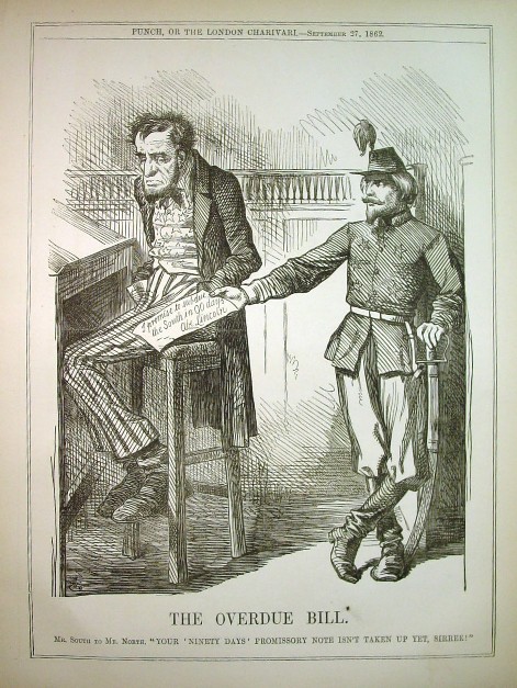 From Lincoln in Caricature by Rufus Rockwell Wilson The cartoon, The Overdue Bill, similar in spirit to the one just described, appeared in London Punch on September 27, 1862—five days after Mr. Lincoln gave the Emancipation Proclamation to the country, an edict which opened a new era in the world’s history. The drawing shows Mr. Lincoln seated at a desk, with hands, as usual, thrust into his pockets, glancing uneasily at a paper inscribed, "I promise to subdue the South in ninety days—-Abe Lincoln,’’ held out to him by a Confederate soldier, who says: “Your ninety days’ promissory note isn’t taken up yet, sirree!’’ Perhaps it would have been more fitting had Punch made the always hopeful Seward the central figure in this cartoon, for it was Mr. Lincoln’s secretary of state, and not the President himself who in 1861 was loudest in proclaiming that the war would end within three months. It is due to Seward to record that when in after years he was questioned by a friend as to the reasons which prompted this famous prediction of his, he at first declined to give an answer, but finally said with some reluctance that he believed at the time that if the South did not yield in ninety days the North would! As a matter of fact the belief that the North would quickly master the South was one confidently cherished by many of Mr. Lincoln’s supporters in the first days of the war. Union defeat at Bull Run, unexpected and disastrous, was the first blow to this belief. It was further impaired in 1862 by McClellan’s luckless campaign before Richmond and by Second Bull Run. Meanwhile, Mr. Lincoln pushed his patient, determined search for a general who could compel success, a general on whom he could rely and on whom he could throw the full responsibility of operations in the fields. Scott, whose past had been a glorious one, failed him because he was old and infirm; McClellan failed him because, although a masterly maker of armies, he faced the enemy with fear and reluctance, and Halleck, when summoned from the West as the right man for the place avoided responsibility as he would the plague, and speedily proved that he was little more than a capable clerk, who could take but could not give orders. The war, however, went on and in March, 1864, the appointment to supreme command of General Grant, a man who said little but did things, cleared the way for Appomattox and final victory.