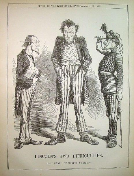 From Lincoln in Caricature by Rufus Rockwell Wilson The cartoon, Lincoln’s Two Difficulties, drawn by another hand than Tenniel, appeared in London Punch on August 23, 1862. The President, again in the guise of Uncle Sam, with hands in pocket and a perplexed expression on his face, exclaims to a tax collector on his right and to a soldier on his left: “What? No money! No men!’’ The men who made up the ruling class of England were, as events proved, sadly at fault in weighing the moral forces behind the Union cause; they were also sorely in error when, until the war was in its final stages, they over-estimated the Union need for men and money with which to wage a winning contest. Volunteer enlistments and then conscription solved the first, and the sale of bonds, in steadily increasing volume the second of these problems. It is true that for a short but anxious period during the last weeks of 1862 and the first of 1863 the Union finances were at a low ebb. Due to faulty methods Government bonds were not selling, and many million dollars back pay were due the men of the army and navy. But there followed a quick and welcome change. Jay Cooke and his agents found ways to induce the people to lend large sums of money to the government, and by early July of 1863 Secretary Chase, well content with results, could declare the popular loan he had devised an assured success, bond purchases then averaging over three million dollars a day. And news of these changed conditions were promptly reported to those in high places in England. ‘‘The secretary of war told me yesterday,’’ Charles Sumner on April 26 wrote to the Duchess of Argyll, ‘‘that our rolls showed eight hundred thousand men under arms—better clothed and better fed than any before. —Besides our army, we have a credit which is adequate to all our needs; and we have powder and salt-petre sufficient for three years, even if our ports should be closed, and five hundred thousand unused muskets in our arsenals, and the best armorers of the world producing them at the rate of fifty thousand a month.” In a measure the soldiers produced by the draft were in some ways inferior to those who had volunteered in 1861 and 1862, but only in a measure. Brawny men from Canada, and sturdy newcomers from Europe entered the Union army in 1863 and 1864, drawn by the high wages offered for military service, and these proved fighting men of the first-class. ‘‘I will see,’’ wrote General Sherman to his brother in April, 1864, ‘‘that by May first I have on the Tennessee one of the best armies in the world.’’ This promise had splendid fulfillment in the months that followed, while in Virginia soldiers of like training and quality enabled Grant to battle Lee to a standstill.