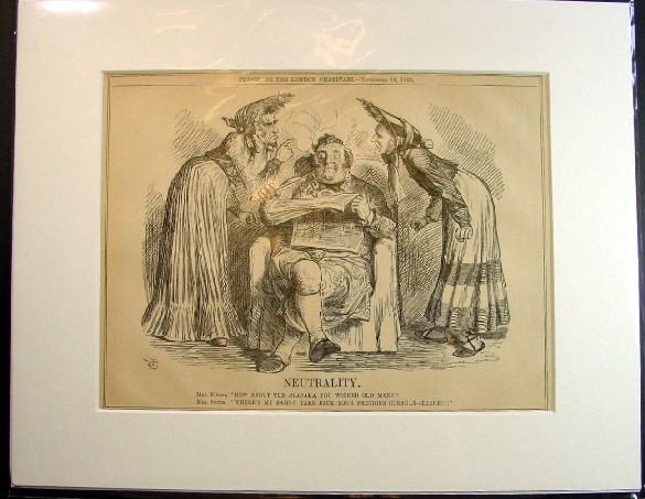 This interesting Punch cartoon caricatures both Abraham Lincoln and Jefferson Davis making their pleas to the symbol of England, John Bull. In Wilson's explanation of the cartoon below he captures the importance of the warship construction in England which highly interested both Lincoln and Davis. What he doesn't mention is the significance of Davis dressed up as a women. When Robert E. Lee surrendered and Jefferson Davis fled Richmond the President of the Confederate States of America was captured shortly after by Union forces in the disguise of a woman! Lincoln In Caricature by Rufus Rockwell Wilson The cartoon by Tenniel, Neutrality, appeared in London Punch on November 14, 1863. Here again the selfish disregard of some Britons for the puissant issues underlying the war between the States is again in evidence. A seated John Bull is shown, calmly enjoying his pipe and morning paper, while President Lincoln and Jefferson Davis, clad as old women, stand one on either side of him, engaged in this angry dialogue:
