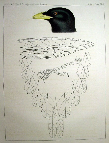 This California Raven with its colored head pictured along with its tail feathers and talons was observed during the California leg of the transcontinental railroad survey of the 1850s. In the top margin it says "USPRR Exp. & Surveys - Calif. & Oregon" and Birds --- Plate XXVI."