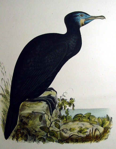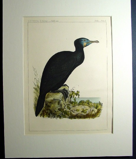 This big shore bird identified in the California expedition and survey published in 1859 has a wingspan of 50 inches is called Brandt's Cormorant. On the top margin of the print is says "U.S.P.R.R. Exp. & Surveys---California" and  "Birds --- Plate X."