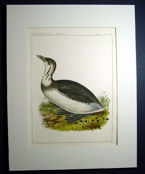 This grebe found in California was identified by John Cassin for the transcontinental railroad expedition and survey. On the upper margin of the print it says "U.S.P.R.R. Exp. & Surveys --- California" and "Birds - Plate IX." Below is the lithograph as it will come to you matted and in a protective clear plastic sleeve.