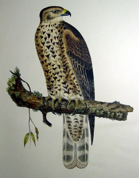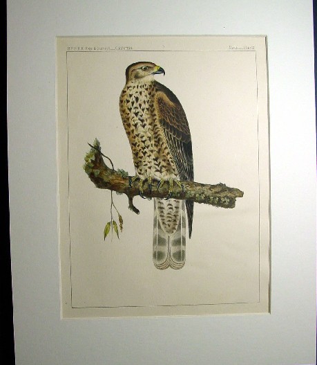 This majestic bird of prey is second example we offer of a red-shouldered hawk. There is nice detail on the unique heart shaped pattern on the breast feathers. On the upper margin of the print it says "U.S.P.R.R. Exp. & Surveys --- California" and "Birds - Plate III."