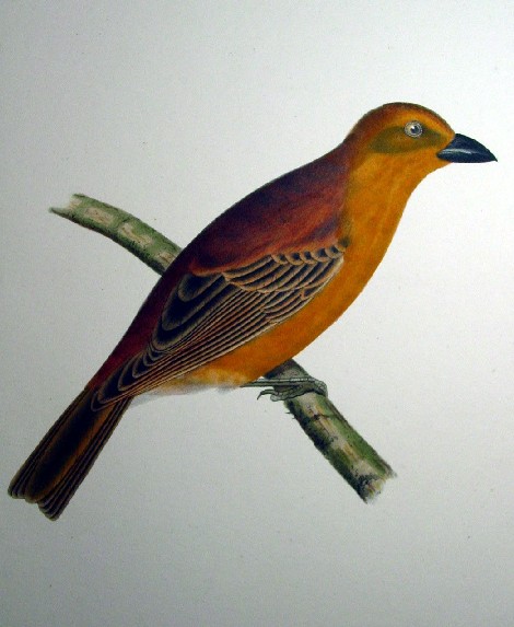 This striking reddish - orange bird identified by John Cassin, the Hepatic Tanaager (or Pyranga Hepatica) was first seen by the railroad expedition and survey in the San Francisco mountains of New Mexico. On the upper margin of the print it says "U.S.P.R.R. Exp. & Surveys --- Cal. & Oregon" and " Birds. - Plate XXXI."