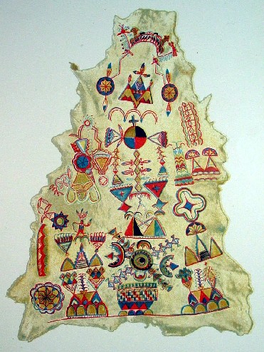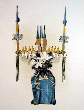 The prints in this section come from the reports of the Smithsonian Institution's Bureau of Ethnology for 1887 and 1888 which was headed by the famous Western explorer John Wesley Powell. The report for that period was published in 1892 and the report of particular interest which included the color plates is the report of Captain John G. Bourke entitled "The Medicine Men of the Apache." The report is fascinating reading and related excerpts of it are included with the chromolithographs shown below. While generally sympathetic to the Indians, including comparing their most ghastly practices to comparable ancient examples, the language used does not adopt the modern convention of trying to sugar-coat the facts in the interest of political correctness. The first two relics pictured below show that the plains Indians were not the ideal "noble savages" in a state of nature that Jean-Jacques Rousseau idealized (“Everything is good in leaving the hands of the creator of things; everything degenerates in the hands of man.”) nor the peaceful creatures of revisionist history (such as the producers of "Dances With Wolves"). Civilization may have considerable evils but pre-civilization often had greater ones. These wonderful lithographs are both illustrative of our nation's history and ethnology and fine examples of Indian art and handcrafts. Click on the pictures or titles below for more pictures and information.