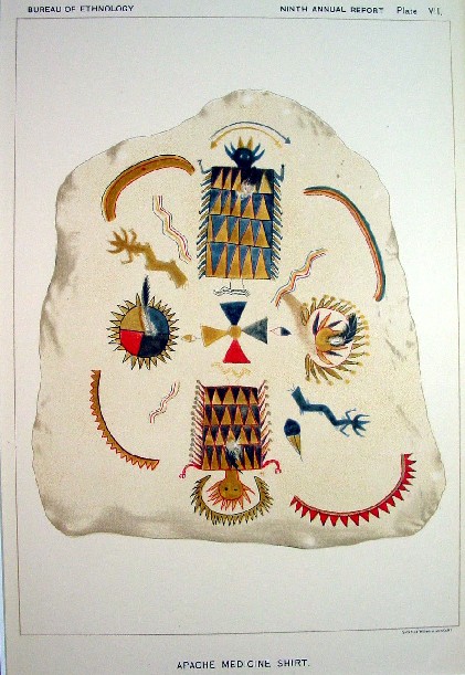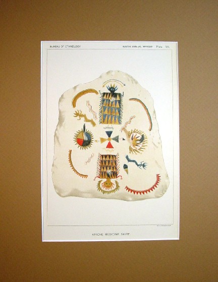 The colorful print as shown below is matted to fit in a standard sized 11 x 14 inch frame and is enclosed in a protective plastic sleeve. It will come with text from the Ethnology Bureau report describing Apache Indians medicine shirts and their uses.