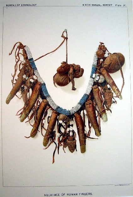 Here is something truly unusual! It is a lithograph of a necklace of human fingers taken from a Cheyenne medicine man during the Indian wars in Montana and Wyoming around 1877. The report of Captain Burke contains an extensive description of this and similar artifacts, the beginning of which is pictured below. Without going into details, beyond the fingers on the necklace there are other body parts and symbols included on this relic. The necklace was considered powerful medicine and its former owner petitioned for its return.