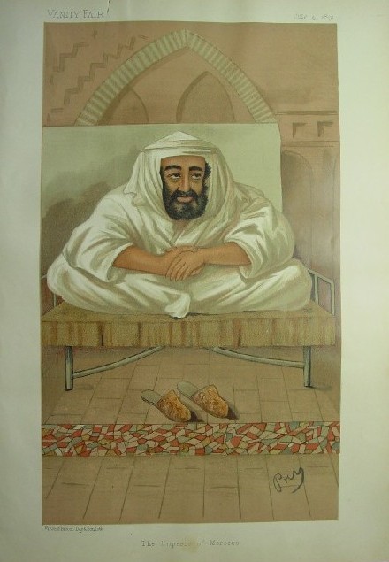This is an original 1891 Vanity Fair lithograph of the Emperor of Morocco pictured in traditional robes sitting cross legged on a raised cushion with his slippers on the floor. This was from the Sovereigns (heads of state or monarchs) series of prints. This print comes already matted to a standard 16 x 20" frame size so it will be easy and inexpensive to frame and is enclosed in a protective plastic sleeve. There is a paperclip rust mark at the top of the print to the right of the "Vanity Fair" and a smudge or on Emperor on the bottom of the print, both as shown above. The price has been marked down from the normal market price for this print as a result of these small defects. Price: $40 Pay securely with credit card through PayPal by clicking the button below