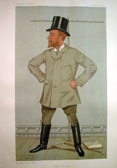 Standing with his hands on hips, a cane and manuscript of one of his famous plays on the stage, Sir Leslie Ward has playwright Henry Arthur Jones striking a jaunty pose in the Vanity Fair portrait published in 1892.