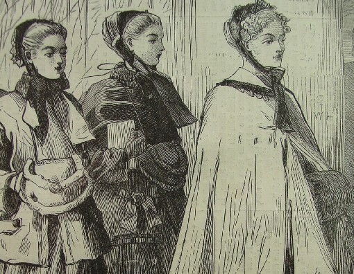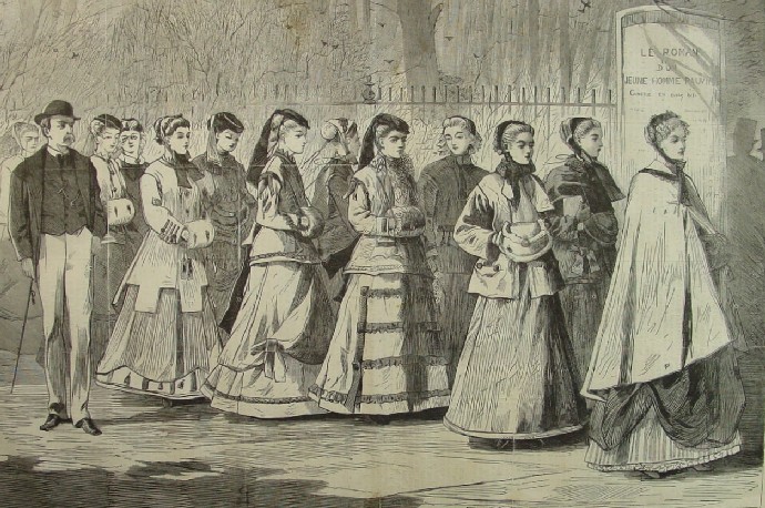 This is an original 1868 wood engraving by Winslow Homer that pictures a parade of young women on their morning walk on the boulevard. Below is a close-up of the ladies at the front of the line