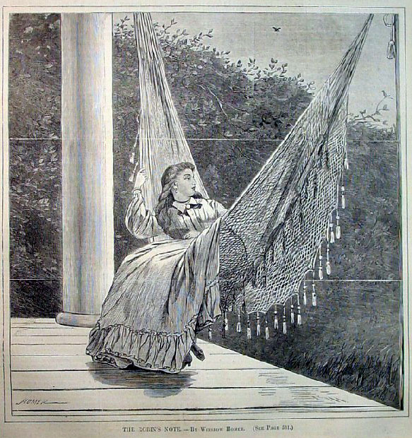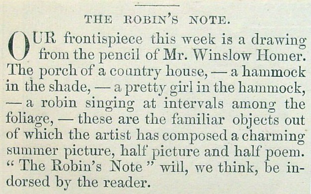 This Winslow Homer print appeared as the cover of the July 20, 1870 issue of Every Saturday. The maiden relaxing on the hammock can hear and see two robins, one on a branch and the other in flight. Below is the text that accompanied the engraving in 1870.
