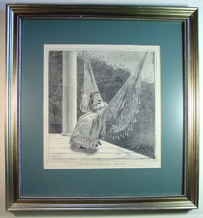 The two parallel horizontal lines in the print are a result of the wood block technology used to make the engraving, it is separation between the wood blocks carved to make the print. The Homer works in Every Saturday are more uncommon than most of his engravings and since this one was a cover piece there were fewer still of these likely to survive in good condition. This Winslow Homer engraving comes already matted and framed and with hanging hardware making it ready to hang with pride on your wall or to give as a treasured gift.