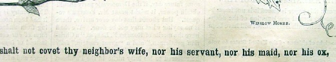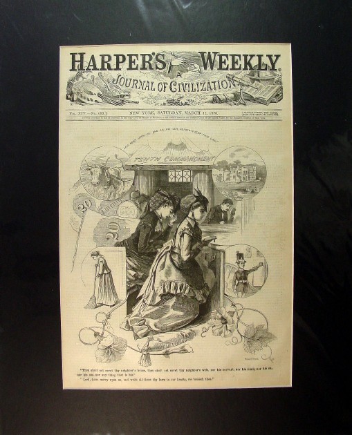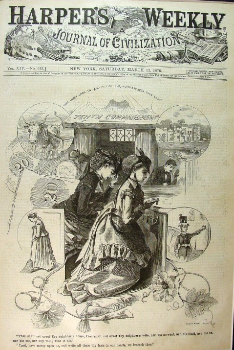 This cover page from the March 12, 1870 Harper's Weekly has Winslow Homer's illustration of the teachings of the Tenth Commandment and picturing all the things we are not supposed to covet by the mandate of the Commandment, (wives, money, property, oxen and asses, etc.). The center of the graphic as two lovely ladies kneeling in church praying and to the side is a guy kneeling and what looks like a covetous look on his face.
