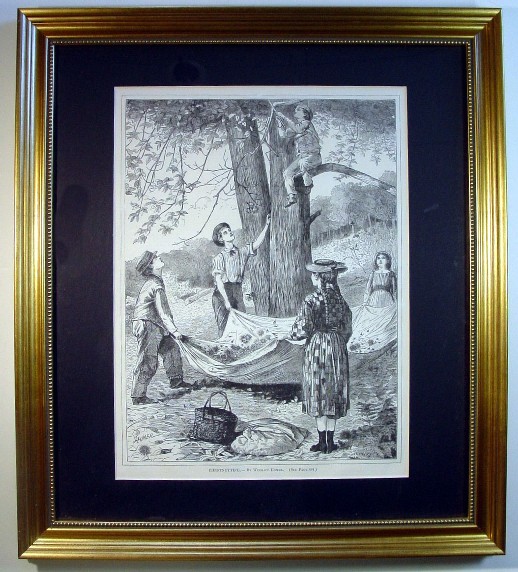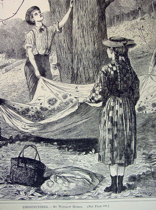 This lovely print appeared in the October 29, 1870 issue of Every Saturday and captures a fall scene typical of Winslow Homer's classic genre prints. Below is the text that accompanied the print on the date of publication which will be included on the back of the framed print. Also pictured below is the left corner of the print with Homer's signature.