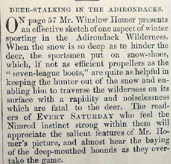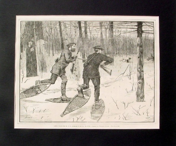 This action print by Winslow Homer is a part of the series of nature prints he did based in the Adirondack Mountains region of the state of New York. This January 21, 1871 print is another engraving coming from Every Saturday that is in excellent condition.
