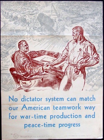 shaking hands, with background pictures of plane, ship, tank and artillery